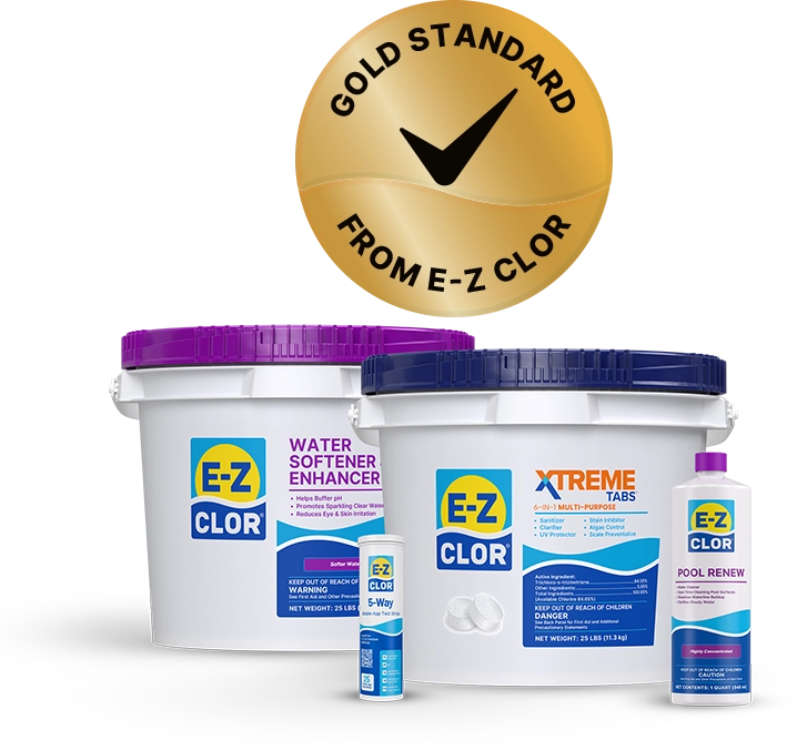 The ideal pool program makes pool care simple and water clarity sparkle! E-Z Clor’s Gold Standard will increase bather comfort, improve water clarity, and ease maintenance frustrations that pool owners often face. Save time and effort on pool care by implementing the Gold Standard in your backyard today. The Gold Standard combines products that are scientifically proven to make pool care easier than ever before! This unique approach enhances any pool program to obtain the ultimate water clarity and ease of pool ownership.